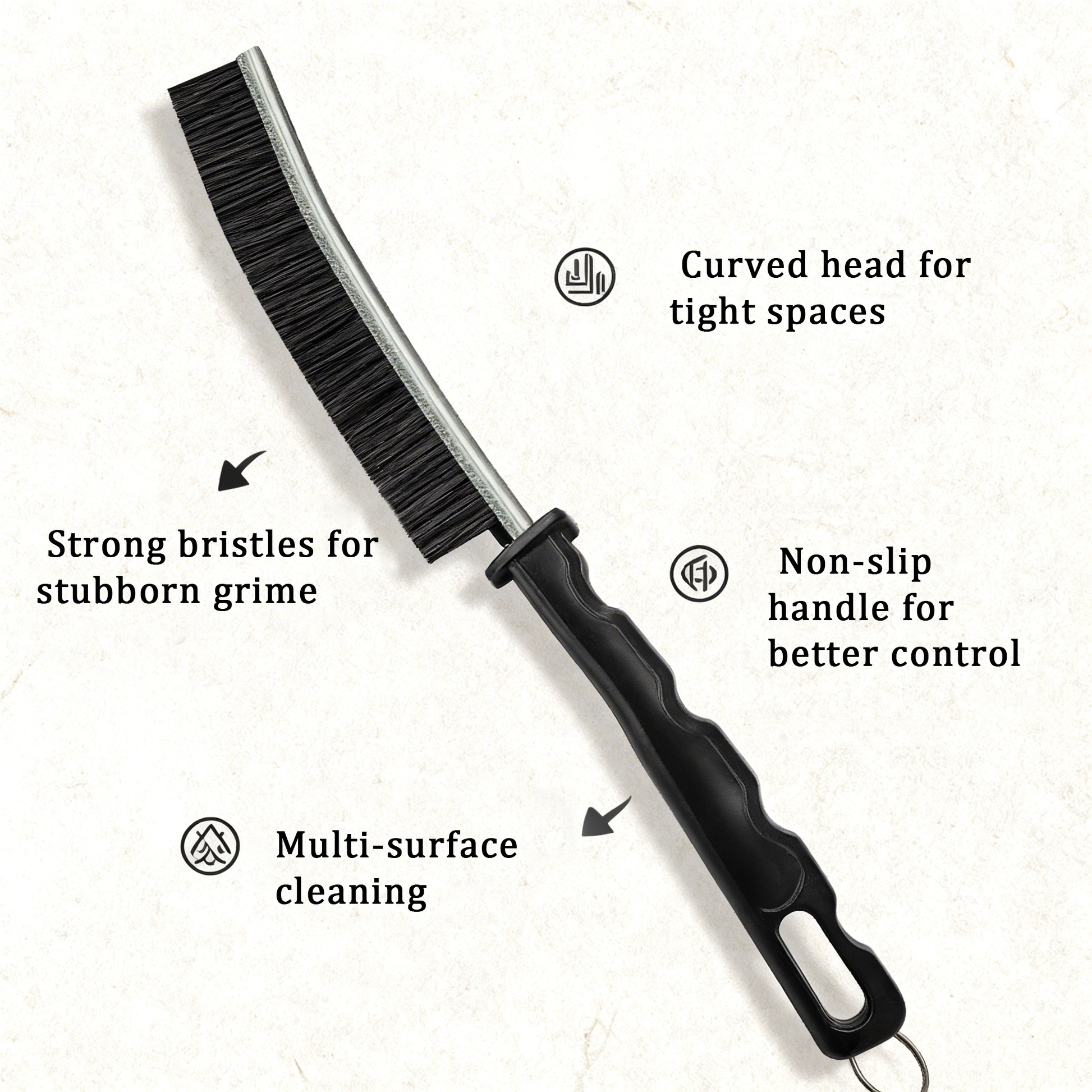 Non-slip handle shape improves control and reduces hand strain during detailed scrubbing tasks.
